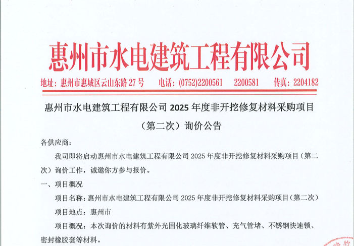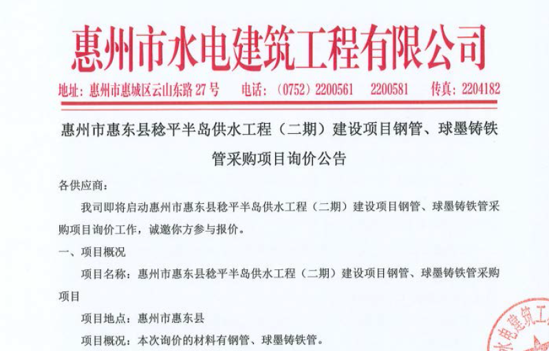 惠州市水電建筑工程有限公司成立于一九六四年四月,隸屬惠州市水務(wù)集團(tuán)有限公司,是一家國(guó)有綜合性施工企業(yè),主營(yíng)水利水電工程、房屋建筑、市政工程等施工業(yè)務(wù)。公司擁有水利水電工程施工總承包一級(jí)、建筑工程施工總承包一級(jí)、市政公用工程施工總承包一級(jí)、公路工程施工總承包三級(jí),公路路基、路面及建筑裝修裝飾專業(yè)承包二級(jí),環(huán)保工程、機(jī)電安裝、河湖整治、輸變電工程專業(yè)承包三級(jí)等經(jīng)營(yíng)資質(zhì)……